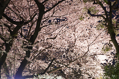 取り急ぎ三脚担いで出かけてみれば、暖かな夜風に誘われて、遊歩道には若い人たちがたくさん夜桜見物に出ています。