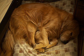 寝返りと言ってもタローの場合、一度立ち上がって反対側に35kgの体を投げ出す。床が板張りなのでどったりと大きな音がして、その都度ボクたちも目が覚める。