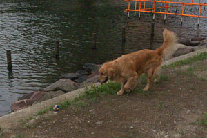 そしてボールを持って勝手に川の方へ行きます。投げてもらえないときの「ひとりボール遊び」がこれです。