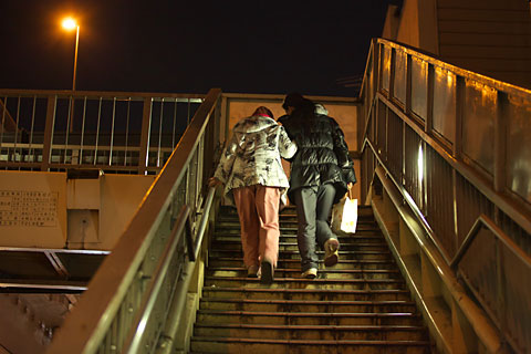 正月早々、歩道橋を足元を気遣いながら登る嫁と姑。