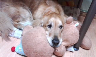 タローが振り回して中の綿を出して、もうぼろぼろですが、昨日の夜は上手にあご乗せに利用していました♪