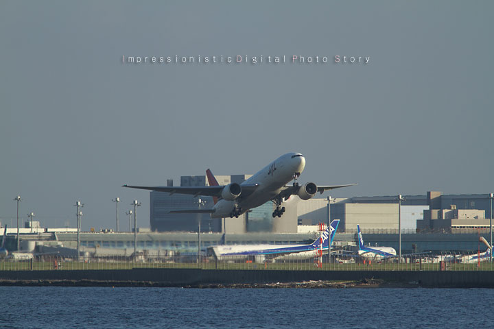 にわかルークはと言えば、…いるいる、あっちにもこっちにも思い思いの望遠レンズをつけた大勢の常連ルークたち。対岸に横たわる羽田空港C滑走路から北に離陸(スリーフォーレフト)する機体を追い、揃ってラジオ体操のように180度の弧を描くレンズの林。