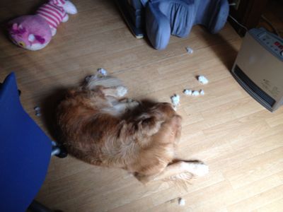 どこにも連れてってもらえないのに、シャンプーだけはしっかりされた休日。全身で不満をアピールしています。