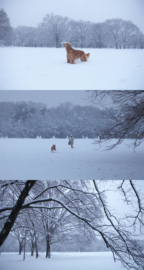 重たい雪のために,園内はタイヘンなことになっていますが,なおみとタローは全くめげず,スキップするように進んでいきます。