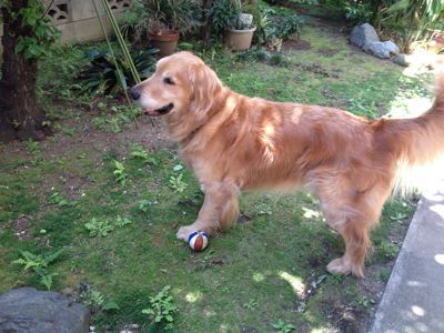 タローがボールを投げろと催促します。投げてやってもすぐ戻ってきて,また投げてよ。