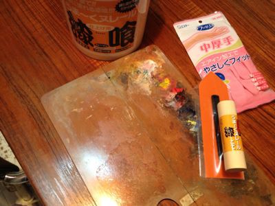 漆喰と専用コテ,古いパレット,おたま,ゴム手袋。