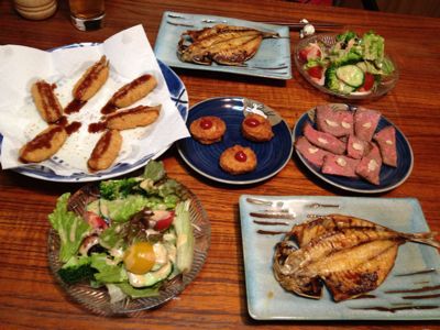 居酒屋のような料理がならびます。後はピンクの風をイメージして壁を塗り替えたお風呂に入って寝るばかり。