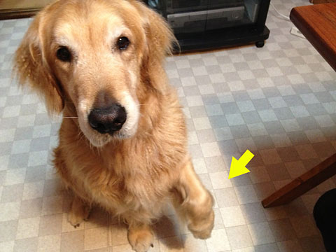 それ,ちょうだいよ。…矢印はタローが唯一の芸「イマムラタロークン(手を挙げる)」である。