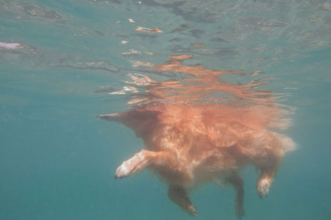 木切れのフェッチに飽きて,沖まで泳ごうと誘ってもなかなか行きたがりません。