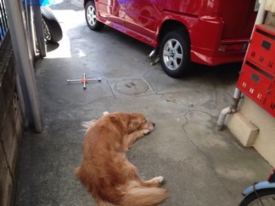 夏のように暑い日に、スノータイヤ装着(笑)