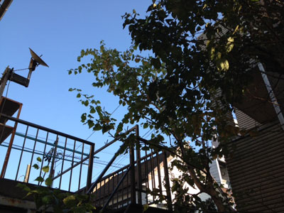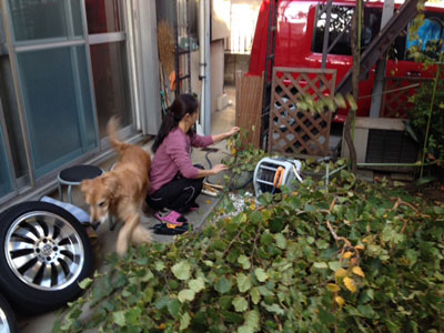 ベランダに脚立立てて,例のターミネーター電のこで高い枝や幹を切り,庭に落として,さらにゴミとして回収してもらえる大きさに処理します。