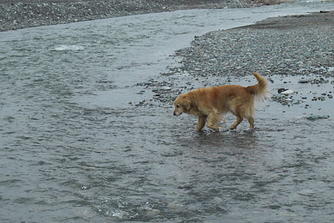 タローと川で遊ぶ。