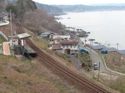 シュウが北リアス線が来るのを待ってます。ずいぶん,場所を探していたのですが,結局,駅のところ以外はほとんどトンネルなのです。