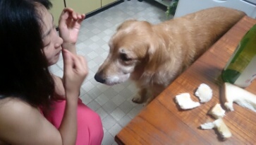 タローの主食はドライフードを熱湯で油抜きして少しふやかしたものだ。準備を始めれば、スキップして着いて回るが、エサの時間に催促することはないから忘れることもある。だから一食抜けるのには慣れている。だが朝に続いて昼も二食抜くと、さすがに空腹を耐えきれなくなると見えて、ボクたちの見えるところに来てステイ(おすわり)し、なるべくいい姿勢でじっと見つめるというアピールに出る。