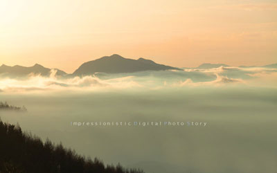 ようやく展望所にたどり着くと,雲海の上に富士がシルエットになり,その真上に24日月が明け残っていた。