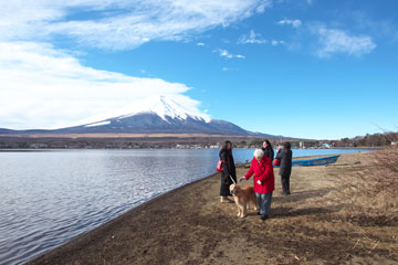 再び空が晴れてきたので,温泉から出た一行も同じ湖岸に連れて来た。さあ,世界遺産の山をタンノーしてくれたまえ。あとは午前中,一気に東京に戻るぞ。