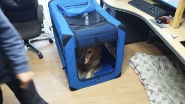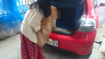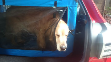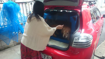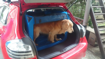 飛行機で出かければ,レンタカーを借りなければならない。犬を乗せるのを許してくれるレンタカーでもケージに入れるのが条件だ。2ヶ月前からソフトケージに入る練習を始めた。