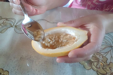 これはデザート。パッションフルーツ。種のところを食べるんだって。