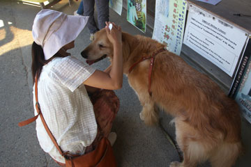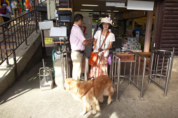 玄関の日陰につないだタローを店の人があやしてくれていた。