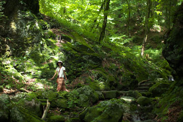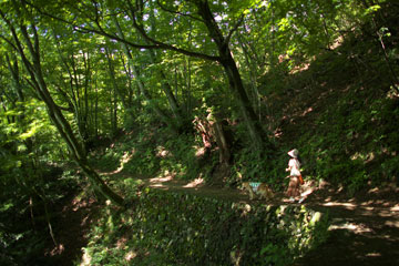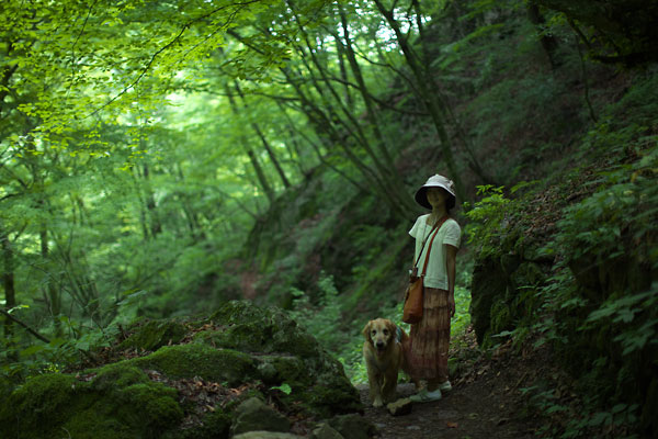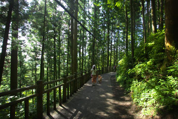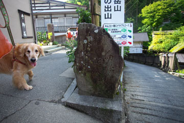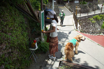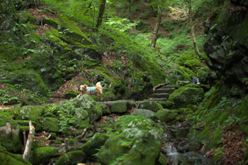 滑り易い渓流を下る道。タローのリードを持って歩くのは危ないので,数十メートルずつボクが先行しては,ハイカーの切れるのを待ってタローを放す。
