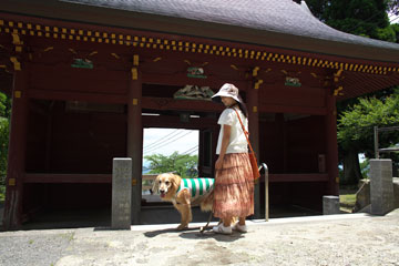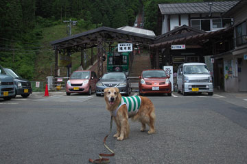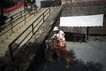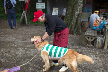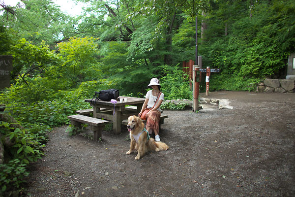 犬もいっしょに入れる食堂で御岳そばのお昼を食べる予定だったけど,日差しが強いのでタローがばててきた。