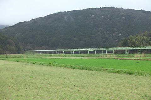 東へ向かうと国道の上を長大な鉄路が跨いでいてかなり驚く。北の山陰から平地を突っ切って南へ消えていく。あとで調べたらセメント会社のベルトコンベアだった。カルスト台地から長門まで16キロ以上石灰石を輸送する施設らしい。