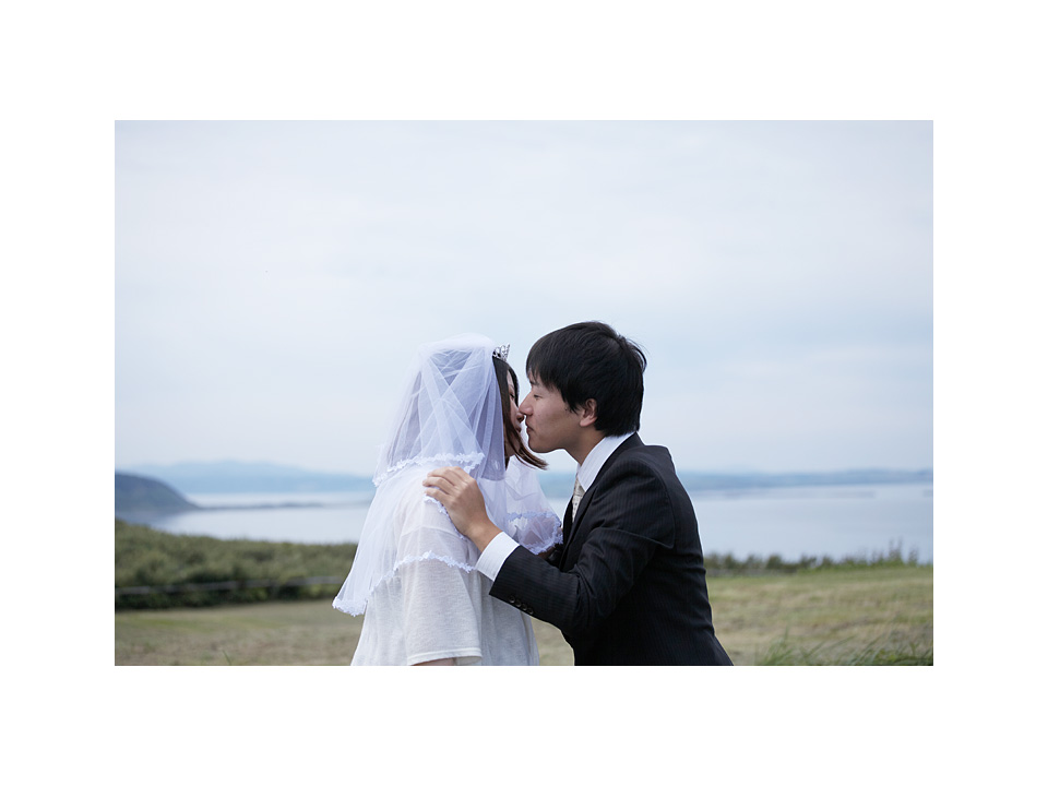 オホーツクの海を背景に,新郎はボクたちがプレゼントしたヴェールを上げて新婦にキスをしました。