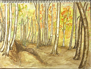 路上で開いたスケッチブックの中に懐かしい風景画がたくさんあった。小山田の雑木林、八ケ岳、しらべ荘の庭、みな師弟で写生した場所だ。デッサンの狂いが目につく。