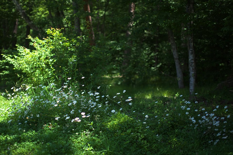 望遠レンズを袈裟懸けにして春夏秋冬タローと出かけた森の入り口。道端に小川に繁みにタローの気配が潜んでいます。タローを喪くして以来,一度も入ったことのない道にシャスタ―デイジーが垣根のように咲いていました。