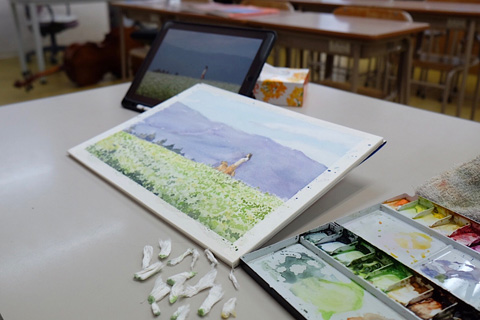 葉の色を置いた後,ティッシュのこよりで一輪一輪色を抜いた。