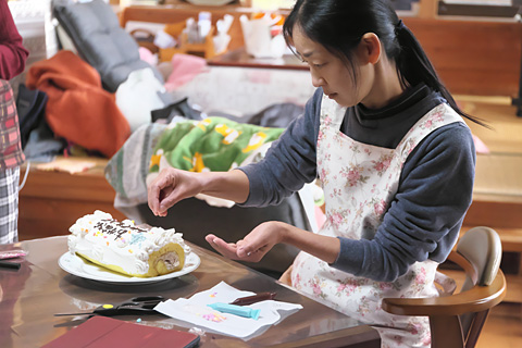 帰宅した。なおみがケーキをデコレーションしている。本当はスポンジから焼くつもりで材料や道具を持って来たが義母から宅配便でロールケーキが届いた。