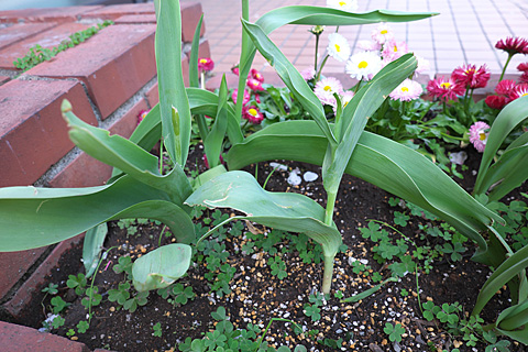 ドレミが折れた茎を立ててやった。この春の玄関はがんばった彼ら花のないチューリップで飾ろう。