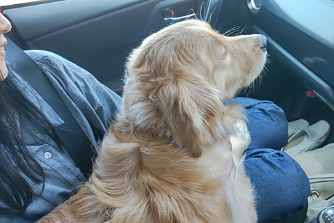 帰りの車中もはしゃぎっぱなし。これから三週間はウチの子である。