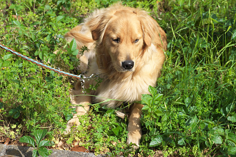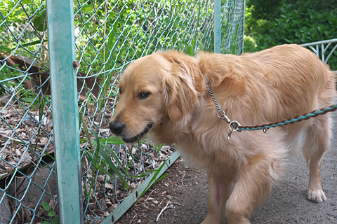 なおみが消防学校のフェンス際で作業している。行かせてもらえないループは不機嫌。なんともわかりやすい表情。
