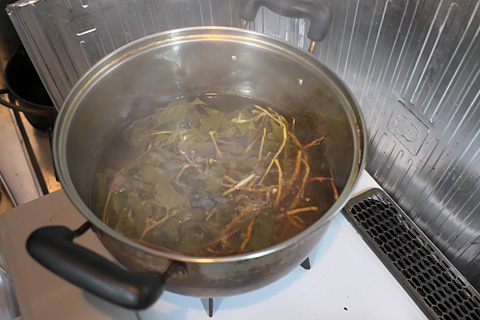 昨日収穫したドクダミを煮出す。半分は陰干しにした。煎じてみる予定。