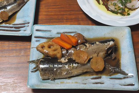 イワシが特価だったので昼に作ったそばつゆの残りで梅干し煮にした。