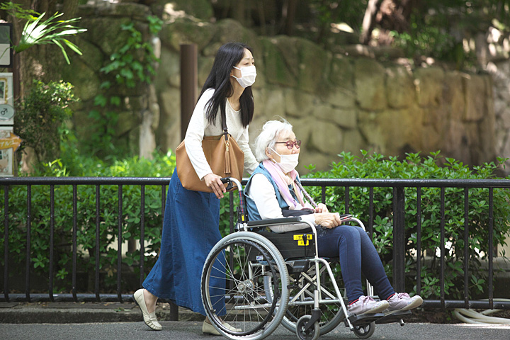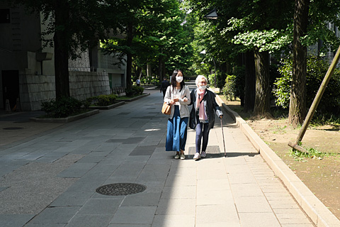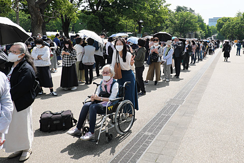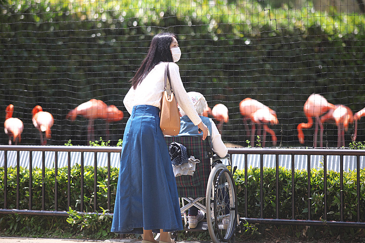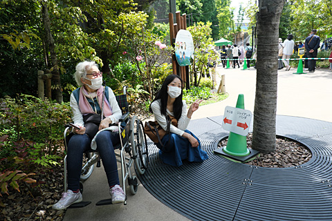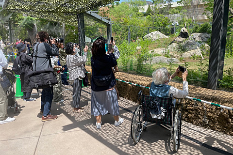 最前列が車椅子の特別コースになっているが四角い枠にしか止まれない。枠からは見えない位置にシャンシャンがいたので,車椅子を押しながらミラーレスで流し撮り。