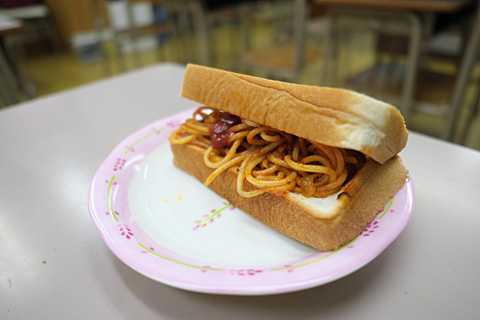 朝食はゆうべのナポリタンの残りでナポリタンサンド。炭水化物のかたまり。