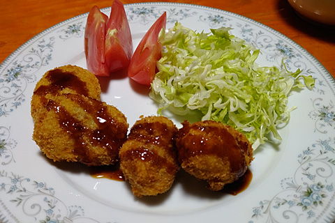 洋食屋でストレスがたまったので,オランダ風コロッケを作ろうと思ってタネを仕込んでおいたのだが,絵本の仕事に熱中しているうちになおみと母が揚げてしまった。見た目,和風に仕上がってしまったが,やっぱり昼のお店より美味しい。