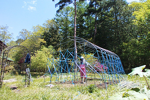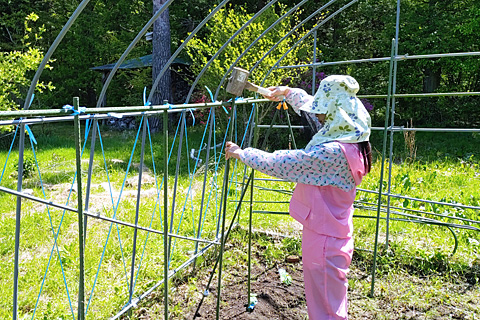 ボクは菜園をオシャレに飾っているわけではない。すずらんテープを張って鹿除けにする作戦である。