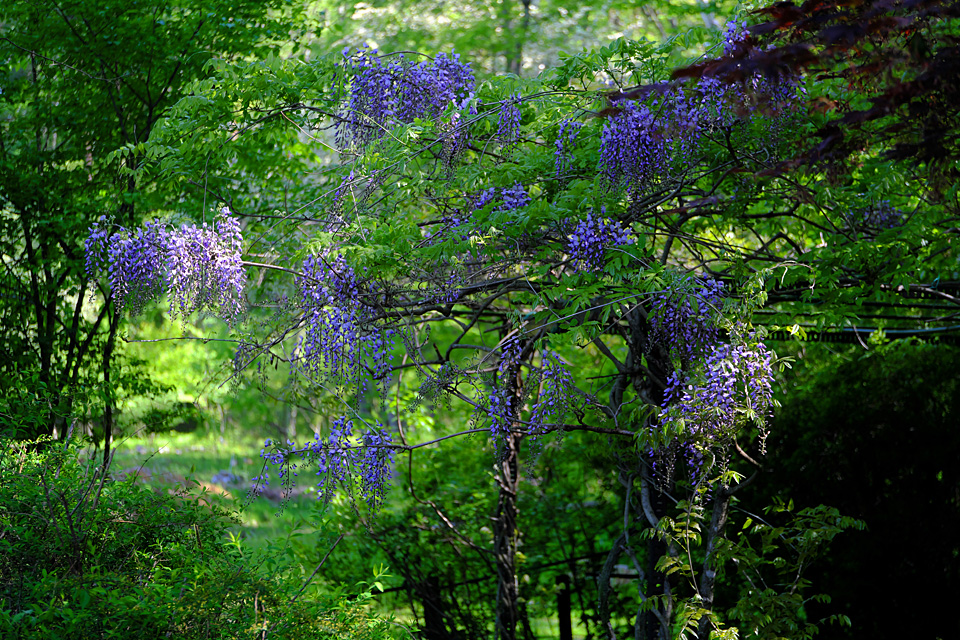 藤棚のノダフジが盛りとなってきた。10年以上手入れしていない。これも野生化している。しらべ荘の花たち強し。