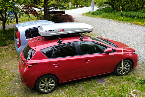 オーリスの屋根にルーフボックスを搭載する。