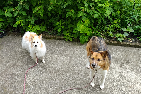 義母のiPhoneをアップデートするために隣家の叔父宅でWiFiに接続させてもらう。この二頭はもうすっかりなついている。