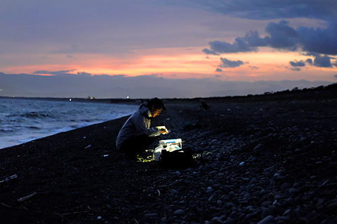 C氏は…と,顧みれば。ひたすら準備に余念がない。空の色には関心がない。好事家とはこうしたものである。しかもC氏の場合,ウルトラ潔癖症的性格が輪をかける。浜から上がって来たときを想定して,潮を浴びた手で触らないよう各種の袋の口を開け,水のタンクを下ろしやすいように並べる。