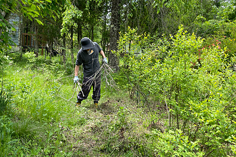 おじいさんは柴刈り。払ったブルーベリーの枯れ枝を集めている。焚きつけにしたらストーブからブルーベリーの香りがするかもしれない。