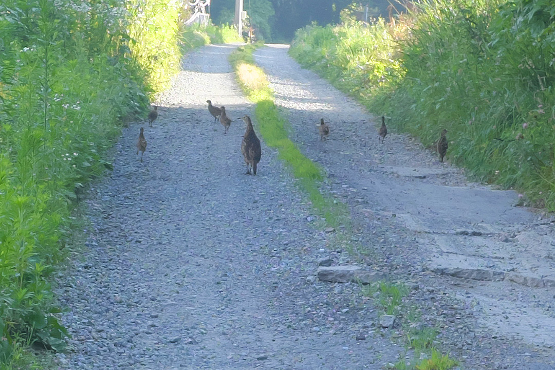 キジに雛たちが生まれていた。警戒心が強くて滅多に見られない。ふだんはオスが守って囮になるので,メスのキジを見ることも稀だ。そのメスが今朝はヒナたちを庇いながら一生懸命逃げてゆく。追わずにそっと見送った。