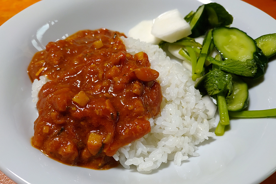 湯剥きしたトマトとありあわせの野菜,それに買いすぎてしまったウインナーを材料に昨日の冷製カレーを再現してみた。