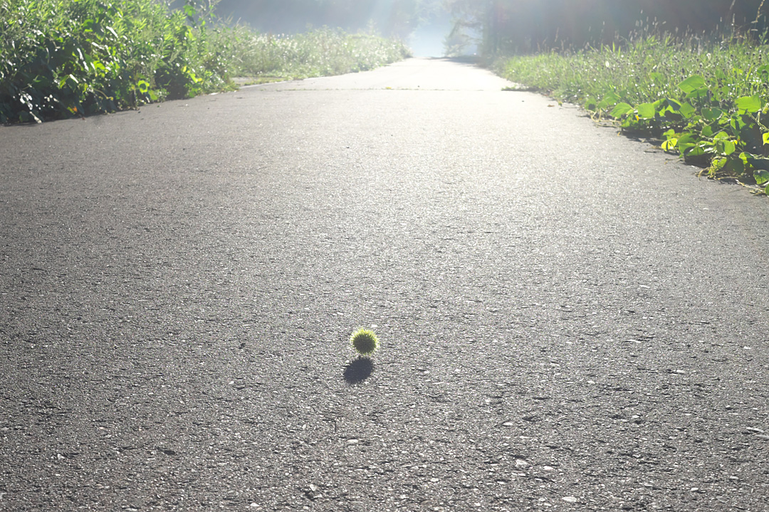 坂道には気の早い鳥に突っつかれたのか,まだ青い毬栗が転がっていた。