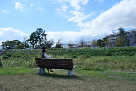 お昼の時間もなくなったのでコンビニで買ったおにぎりを河川敷で食べた。向こう岸のパッとしない建物が今日の目的地。