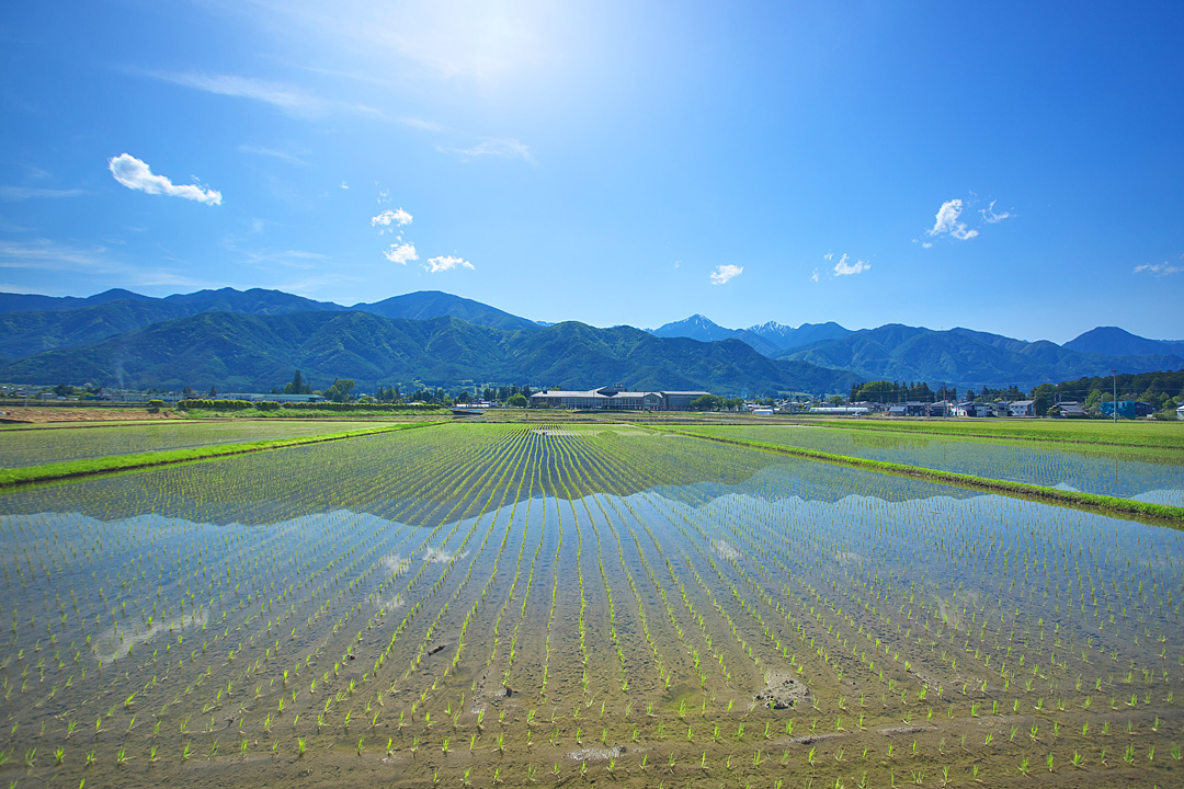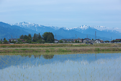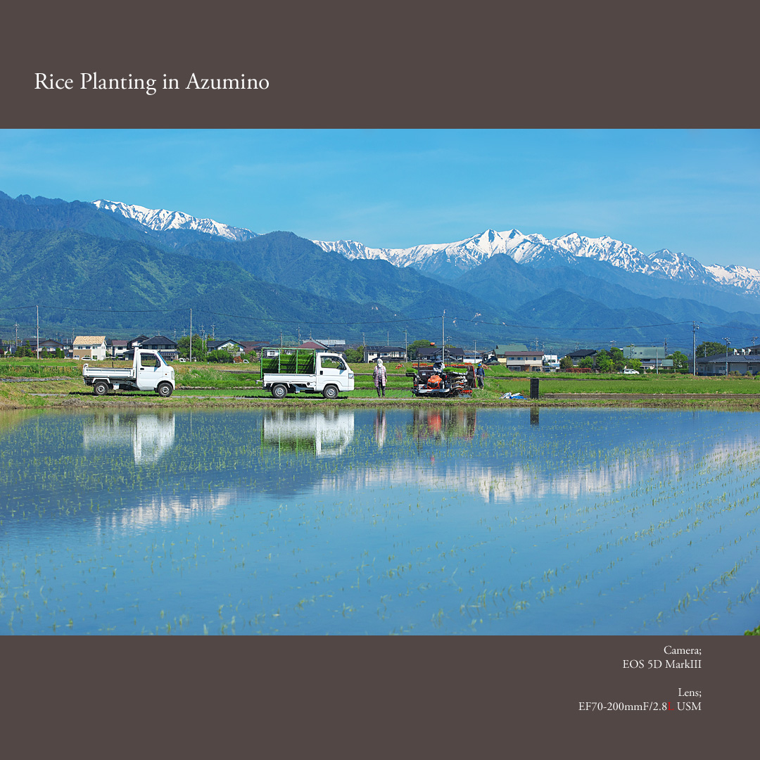 代掻きが終わり田んぼにたっぷりと水が入ってから苗が育つまでのわずかな期間、そして山には残雪、快晴の空、風はなし…以上の条件が揃ったときに安曇野に行かないとなかなか水鏡の北アルプスは撮れない。